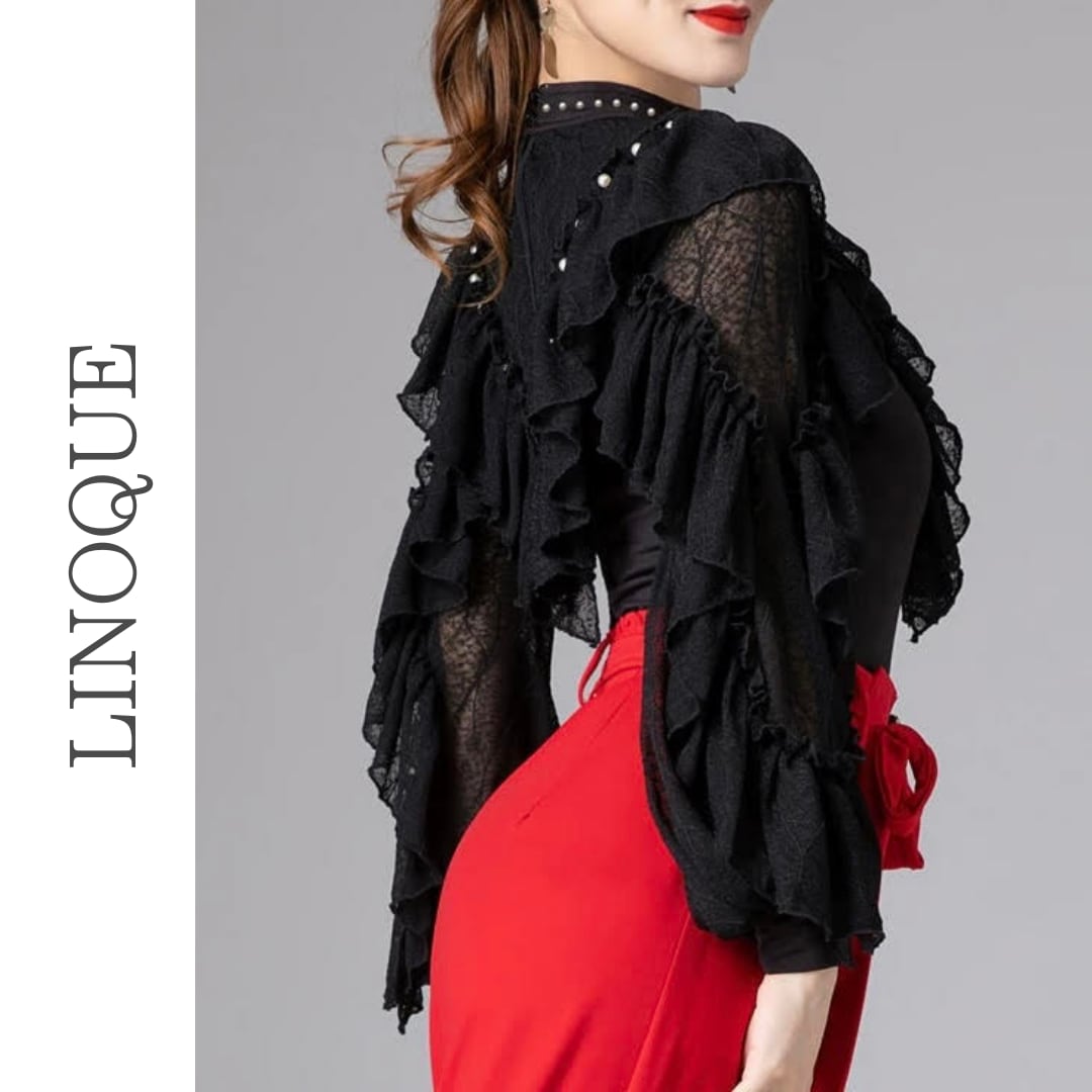 ハイカラーが特徴的なパールフリルレオタードです。ブラックのシックな色合いとフリルデザインが優雅さを引き立て、エレガントな印象を与えます。動きに合わせてきらめくパール装飾が、あなたの姿を一層魅力的に演出してくれます。
