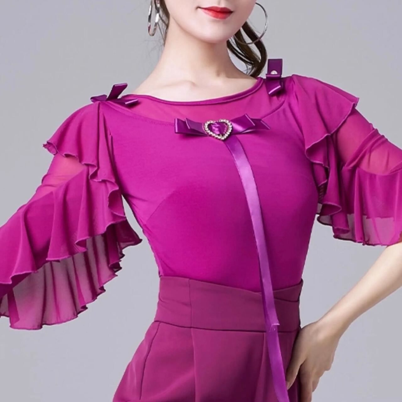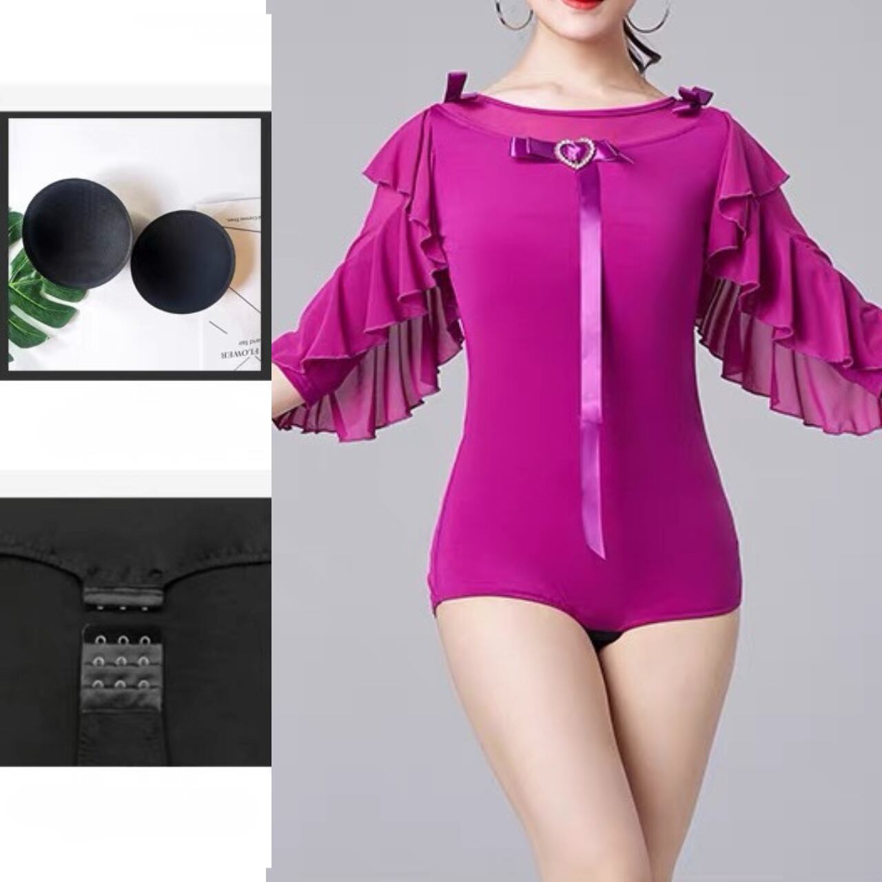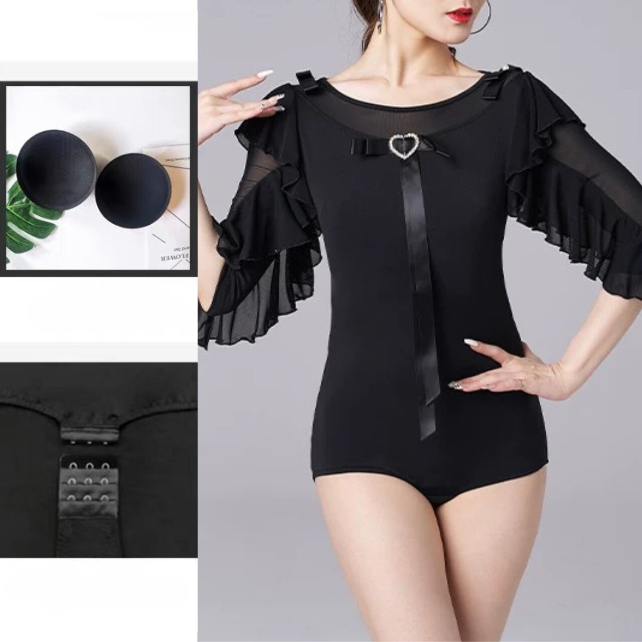 【商品管理番号】 L00117 【商品説明】 胸元のハートモチーフとリボンディテールが印象的なフリルスリーブレオタード。透け感のある袖と柔らかなフリルが上半身に立体感を与え、動きの中でも美しいシルエットを演出。身体に程よくフィットするデザインで、練習時はもちろんステージシーンにも映える一着です。 PURPLE/BLACK 【サイズ】 【M】バスト:78-90cm/ウエスト:68-78cm/着丈:85cm 【L】バスト:82-94cm/ウエスト:72-82cm/着丈:86cm 【XL】バスト:86-98cm/ウエスト:76-86cm/着丈:87cm 【2XL】バスト:90-102cm/ウエスト:80-90cm/着丈:88cm ※サイズは測り方により1-3㎝の誤差が生じる場合がございます。 【素材】 95%ポリエステル/5%ポリウレタン ▼ご購入前にこちらを必ずお読みください https://admin.thebase.com/shop_admin/design/themes?r=about
