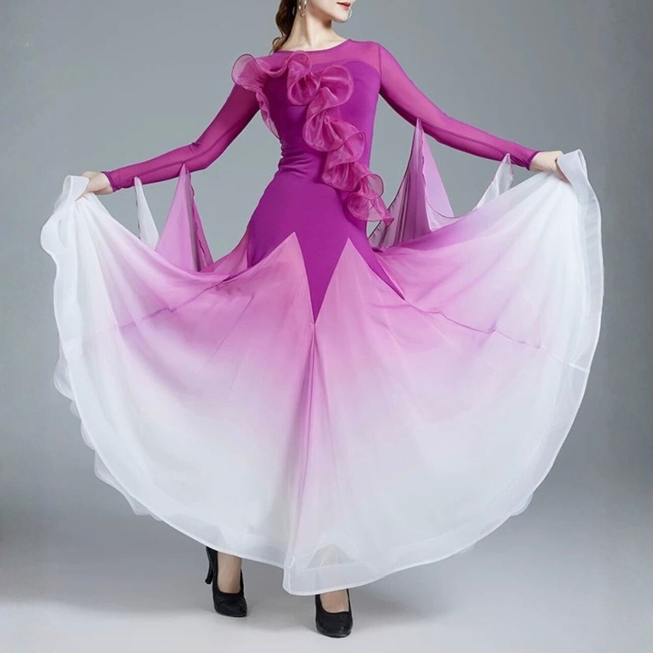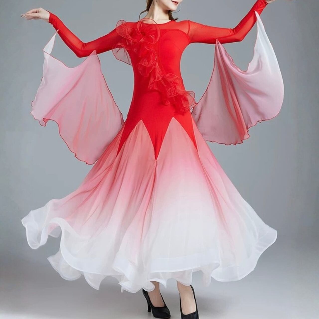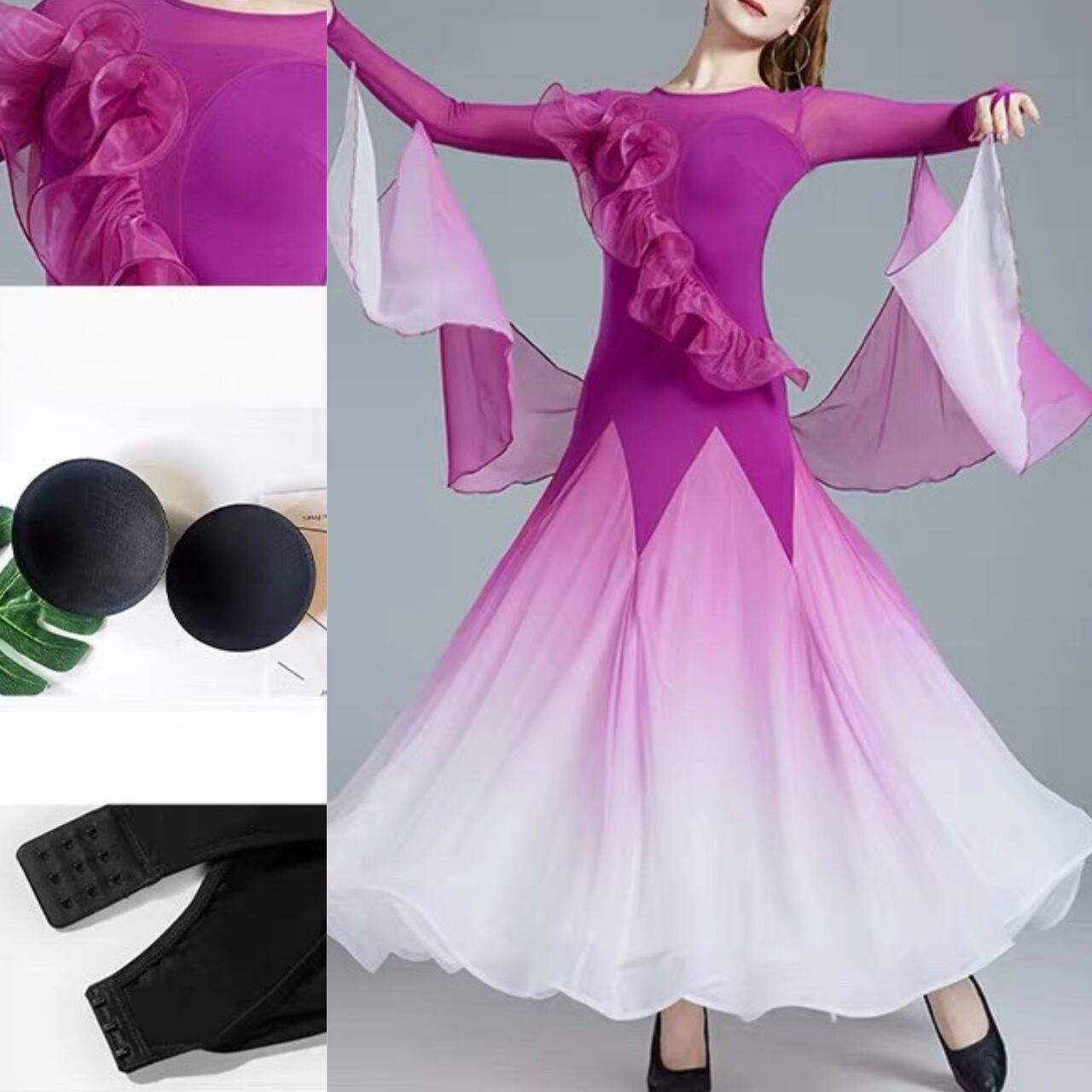 【商品管理番号】 L00122 【商品説明】 グラデーションが映えるシフォンのドレス。透け感のある袖と立体フリルが上半身を印象的に見せます。広がるスカートがラインをきれいに見せて、ステージでも写真でも映える一枚です。 RED/PURPLE/BLACK 【サイズ】 【M】バスト:78-90cm/ウエスト:68-78cm/着丈:120cm 【L】バスト:82-92cm/ウエスト:72-82cm/着丈:121cm 【XL】バスト:86-96cm/ウエスト:76-86cm/着丈:122cm 【2XL】バスト:90-102cm/ウエスト:80-90cm/着丈:123cm 【3XL】バスト:94-106cm/ウエスト:84-94cm/着丈:124cm ※サイズは測り方により1-3㎝の誤差が生じる場合がございます。 【素材】 95%ポリエステル/5%ポリウレタン ▼ご購入前にこちらを必ずお読みください https://admin.thebase.com/shop_admin/design/themes?r=about