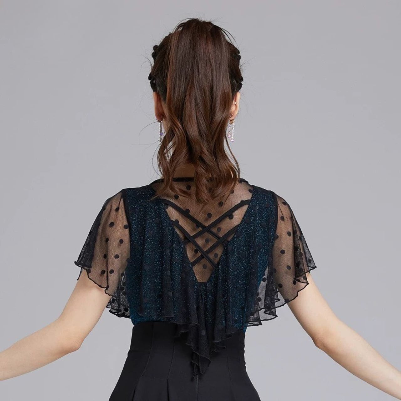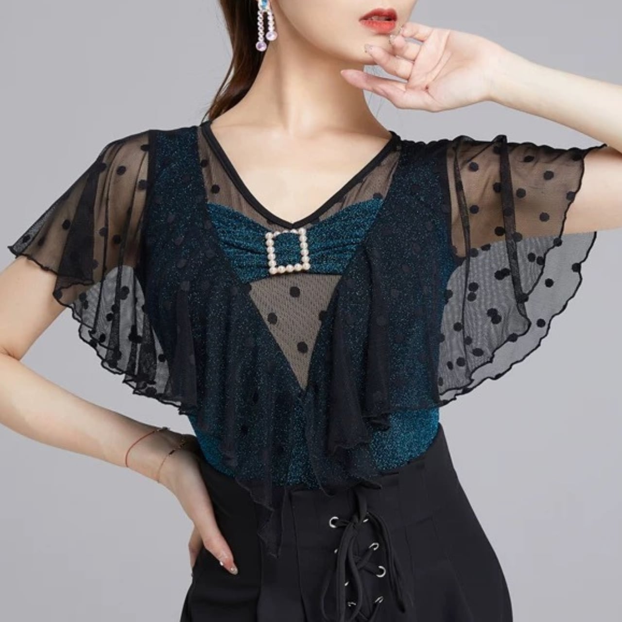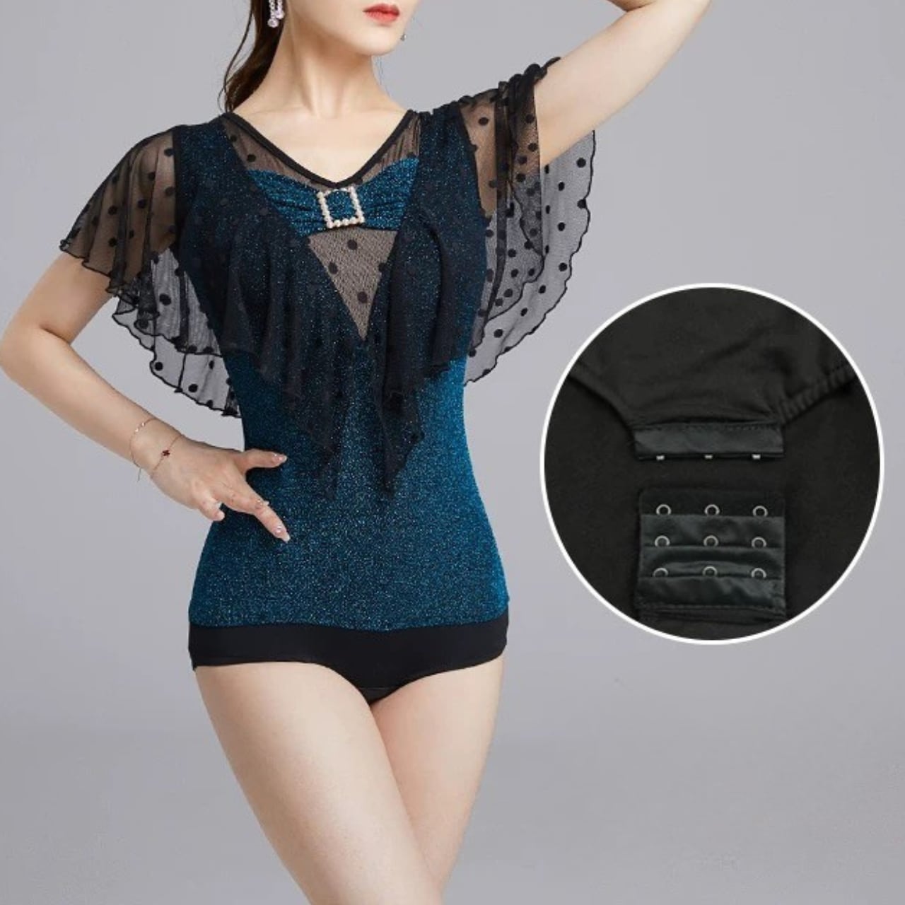 【商品管理番号】 L00103 【商品説明】 シアーなドット袖とラメ感のある質感が目を引くレオタード。胸元のパールバックルとクロスデザインで、上半身をすっきり見せるバランスに。フィット感のある着用感で重ね着にも使いやすい、印象を引き立てる一枚です。 PEACOCKBLUE 【サイズ】 【M】バスト:78-88cm/ウエスト:64-72cm/着丈:82cm 【L】バスト:82-92cm/ウエスト:70-80cm/着丈:83cm 【XL】バスト:86-96cm/ウエスト:76-84cm/着丈:84cm 【2XL】バスト:90-100cm/ウエスト:82-90cm/着丈:85cm ※サイズは測り方により1-3㎝の誤差が生じる場合がございます。 【素材】 95%ナイロン/5%ポリウレタン ▼ご購入前にこちらを必ずお読みください https://admin.thebase.com/shop_admin/design/themes?r=about