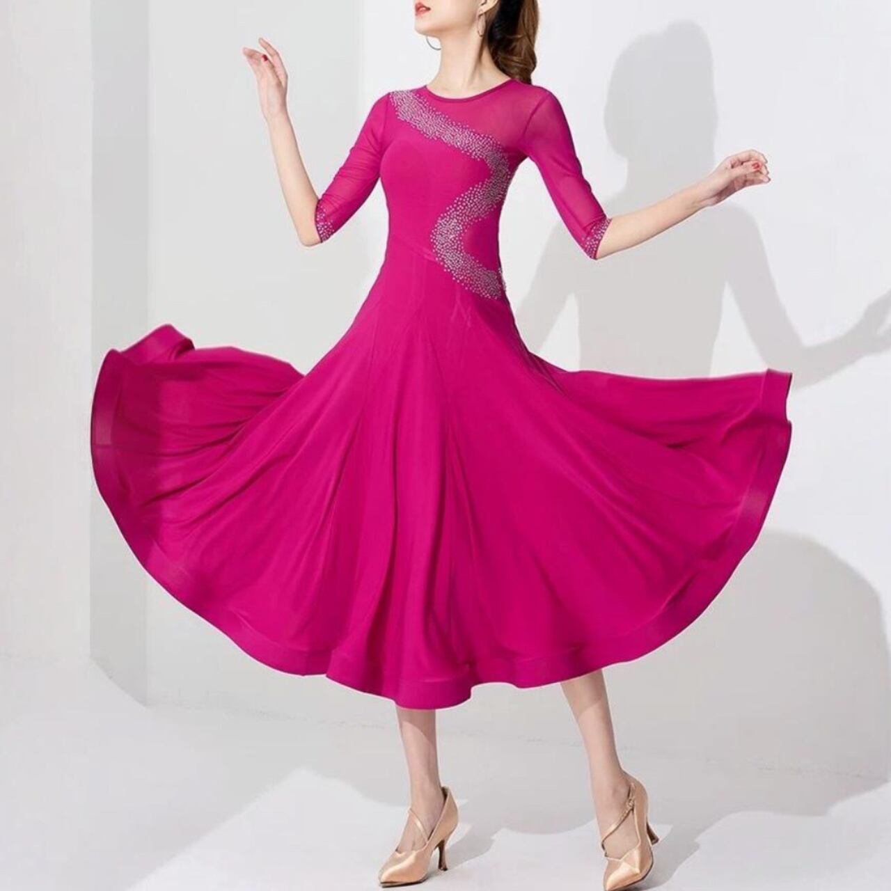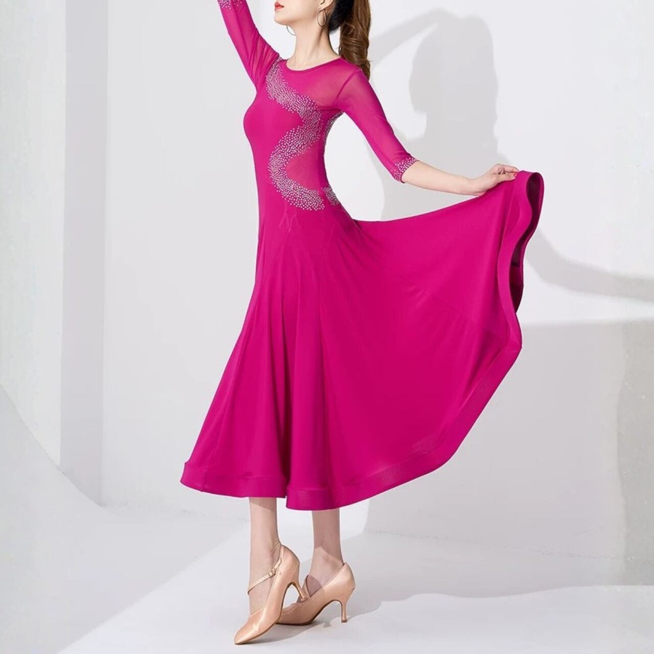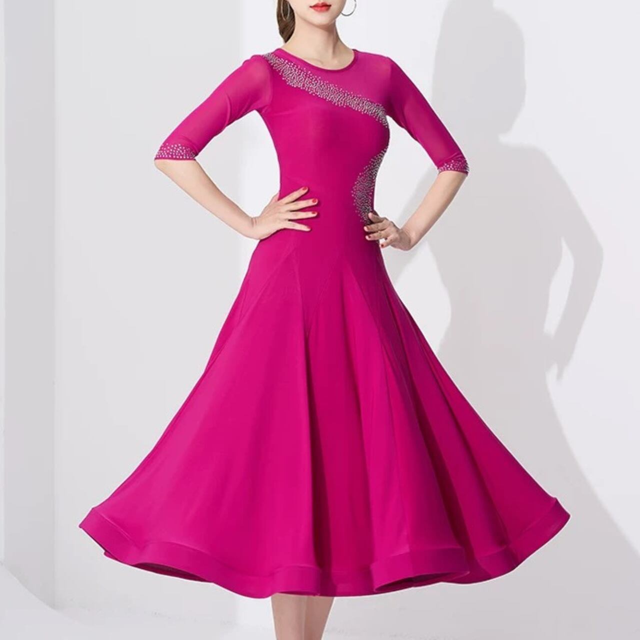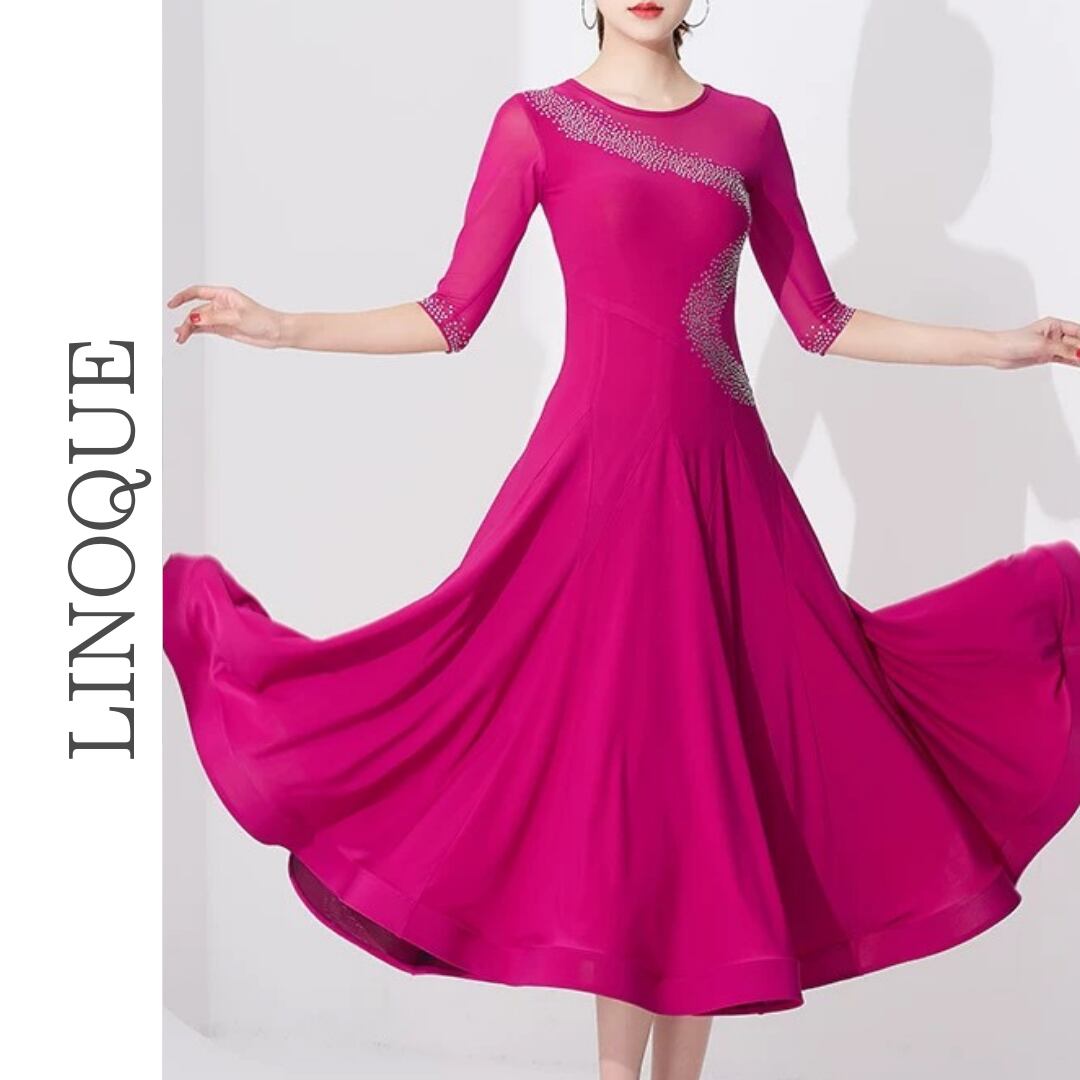 【商品管理番号】 L00135 【商品説明】 斜めに流れるラインストーンデザインが目を引くワンピース。七分袖のシアー切替と広がるフレアで動きをきれいに見せます。華やかさをプラスする一枚です。 PINK/RED/BLACK 【サイズ】 【M】バスト:76cm/ウエスト:64cm/着丈:110cm 【L】バスト:80cm/ウエスト:68cm/着丈:112cm 【XL】バスト:84cm/ウエスト:72m/着丈:114cm 【2XL】バスト:88cm/ウエスト:76cm/着丈:116cm 【3XL】バスト:92cm/ウエスト:80cm/着丈:118cm ※サイズは測り方により1-3㎝の誤差が生じる場合がございます。 【素材】 95%ナイロン/5%ポリウレタン ▼ご購入前にこちらを必ずお読みください https://admin.thebase.com/shop_admin/design/themes?r=about