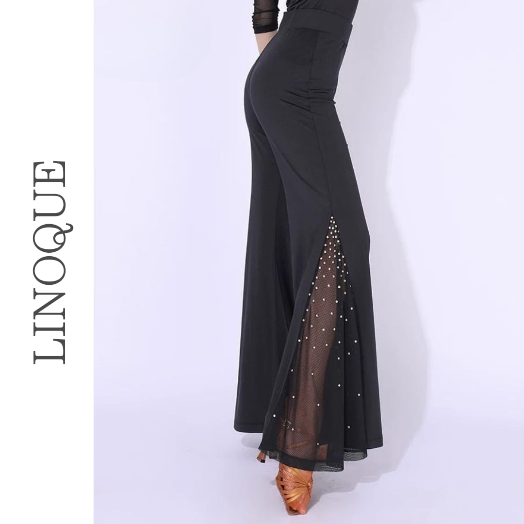 シースルー素材にラインストーンが煌めく、スタイリッシュなフレアパンツです。ワイドなシルエットが脚を美しく見せてくれます。2カラー展開で、あなたのおしゃれを引き立てるアイテムです。