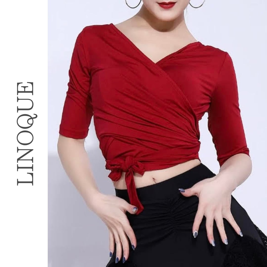 エレガントな印象を与えるVネッククロスショート丈五分袖トップスです。Vネックデザインとクロススタイルが、デコルテを美しく演出し、シンプルながらも存在感を放ちます。3カラーバリエーションなので、お好みに合わせてお選びいただけます。