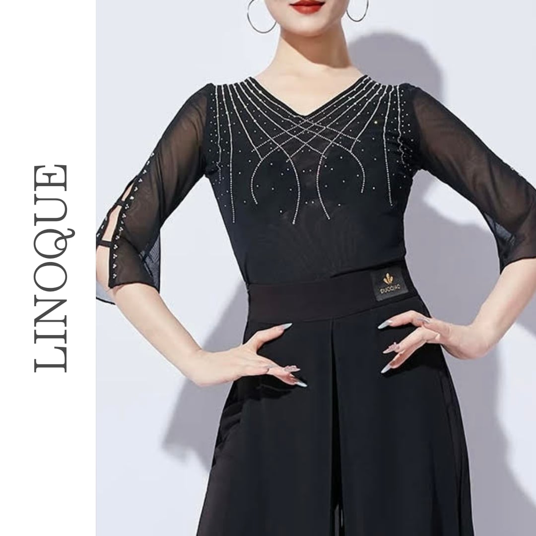 輝くラインストーンをあしらったVネックシースルー五分袖トップスです。華やかなデザインが特徴で、特別な日のコーディネートにぴったり。シースルーの素材感は涼しげで軽やか、五分袖で程よい露出感を演出します。キラキラと輝くラインストーンが、あなたのスタイルに華を添えます。