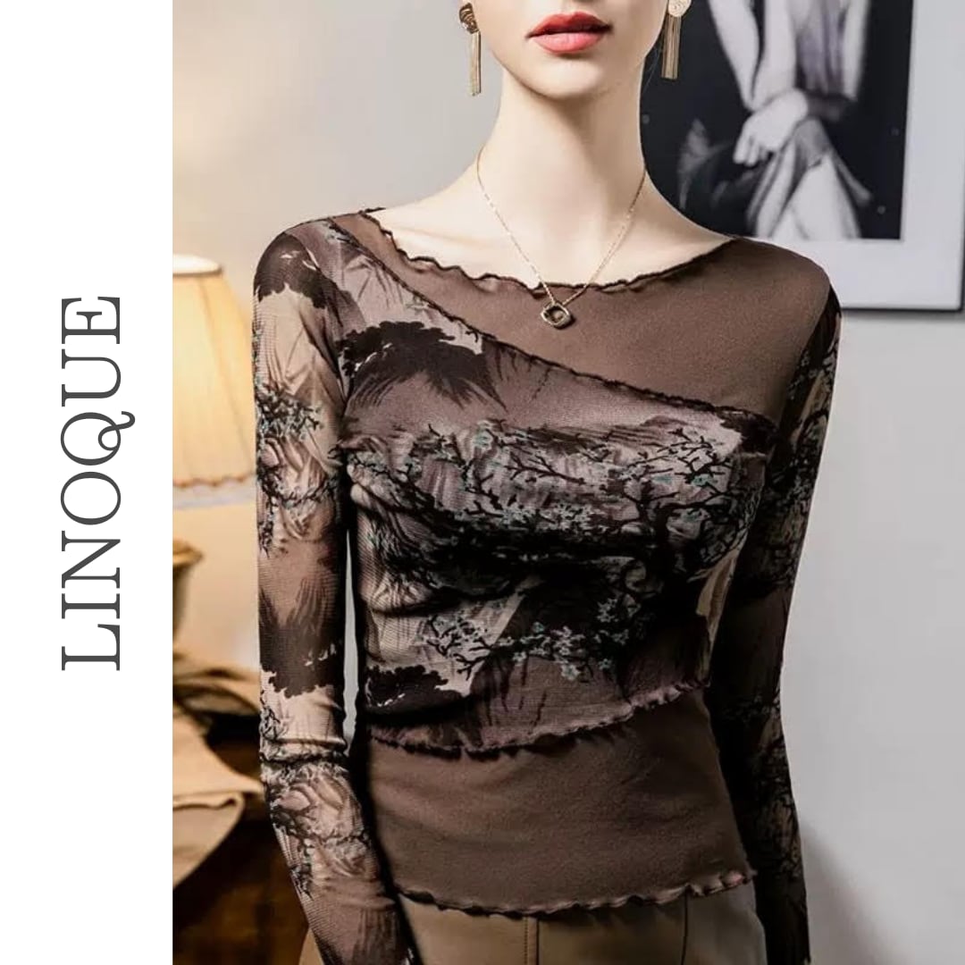 レトロな雰囲気が漂うシースルーオフショルダープリントデザイントップスです。透け感のあるシースルー素材が、着る人の魅力を一層引き立てること間違いなし。軽やかな印象を与え、どんなスタイルにも合わせやすいアイテムです。