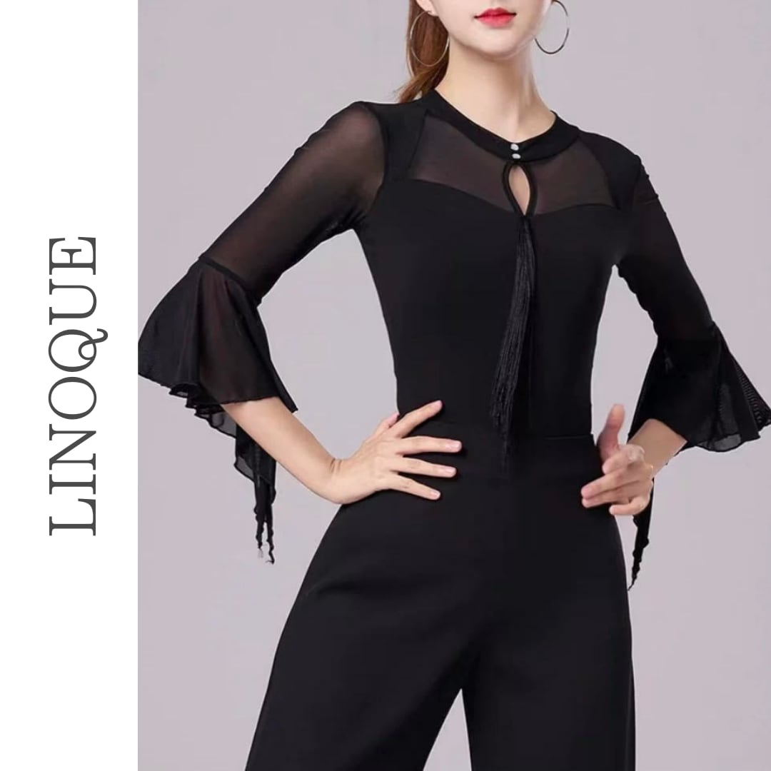 タッセル付きのシースルーレースレオタード。独特な透け感を楽しめるデザインが特長で、パフォーマンスやダンスシーンでの存在感を引き立てます。ブラックカラーがシックな印象を与え、どんなスタイルにもマッチしやすい優れたアイテムです。